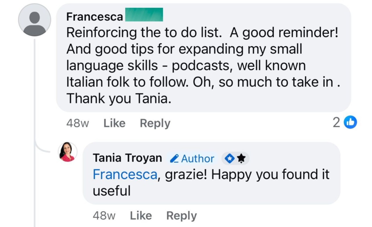 "Tania is my first Italian teacher and I find her course thorough and inspirational.